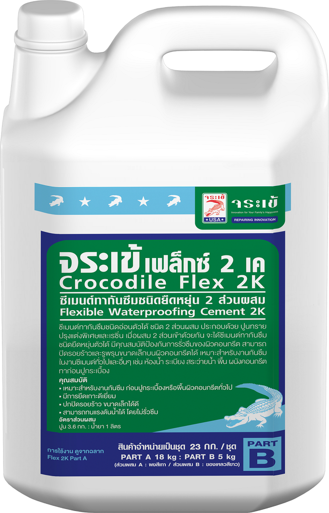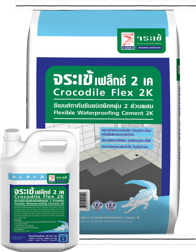 Crocodile Flex 2K là vật liệu chống thấm hai thành phần gốc xi măng, tạo màng đàn hồi bền chắc, chịu áp lực nước cao.