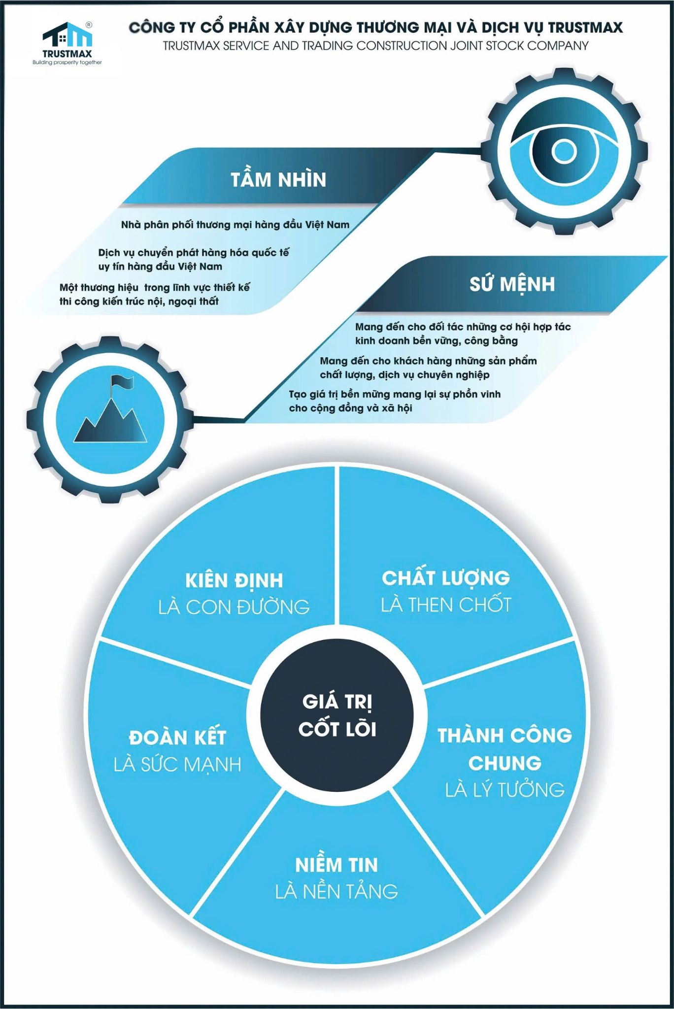 Công ty Cổ phần Xây dựng Thương mại và Dịch vụ Trustmax là một doanh nghiệp tư nhân hoạt động chính trong lĩnh vực Xây dựng dân dụng và công nghiệp. Kinh doanh phân phối các loại vật liệu hoàn thiện như sơn, keo, phụ gia và hóa chất xây dựng. Với kinh nghiệm hơn 30 năm trong nghề, Trustmax là chuyên gia tư vấn mang đến cho khách hàng những giải pháp ứng dụng tối ưu vật liệu hoàn thiện công nghệ cao. Đồng thời, Trustmax cũng trực tiếp ứng dụng các vật liệu cao cấp trong các dự án thiết kế thi công nội, ngoại thất và tham gia vào các hoạt động đầu tư khác.