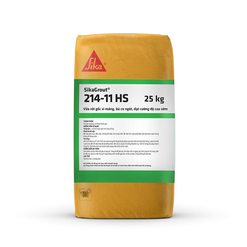 SikaGrout®-214-11 HS – Vữa rót gốc xi măng, tự san bằng, bù co ngót, không chứa sắt, đạt cường độ cao sớm. Sản phẩm được trộn sẵn với thành phần cốt liệu tuyển chọn, tạo hỗn hợp đồng nhất, lý tưởng cho các hạng mục cần chịu lực nhanh và ổn định thể tích.